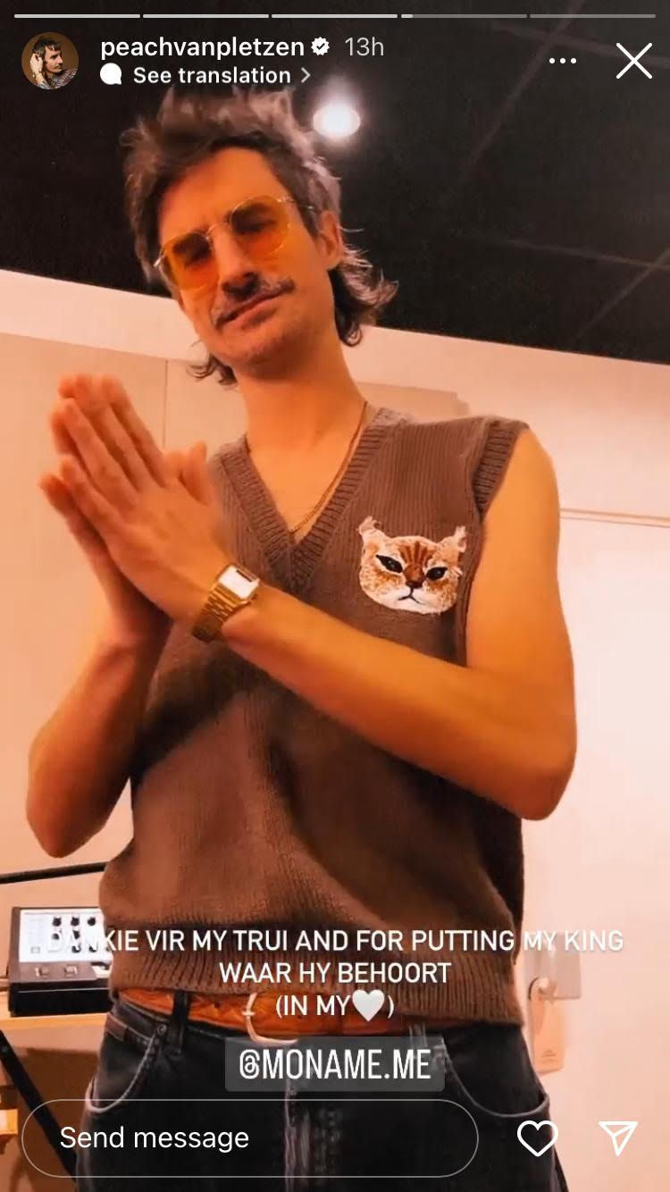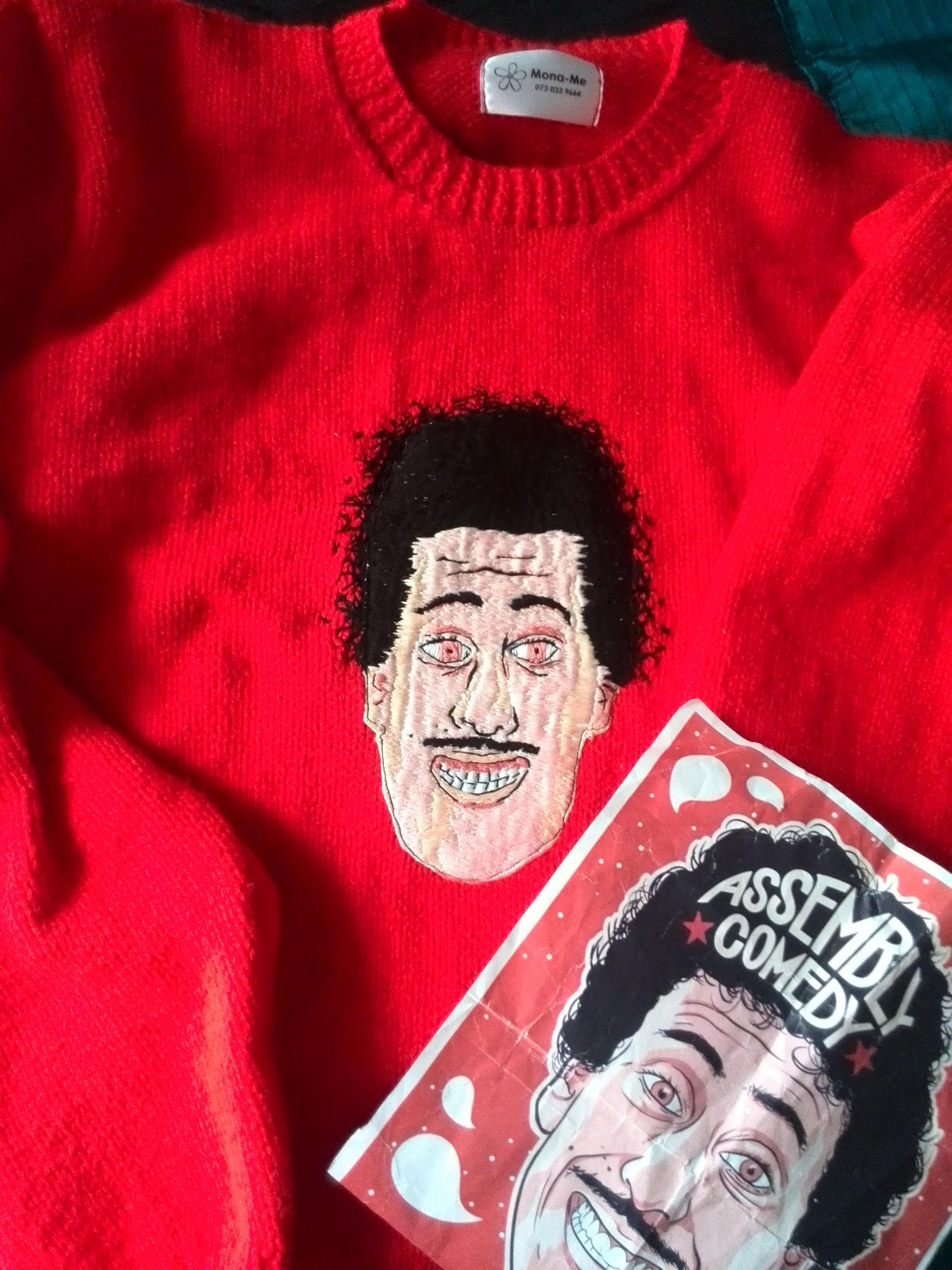 "Ek het sedert daardie dag vir elkeen van my one-man shows 'n trui met die titel op deur Monique laat brei." - Schalk Bezuidenhout